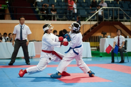 BANGKOK,THAILAND - SEPTEMBER 9 Female fighter between participants of Thailand Open Karate-Do Championship 2013 on Nimibutr National Indoor Stadium, September 9, 2013, Bangkok,Thailand