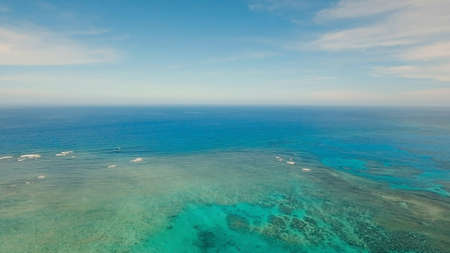 Coral reefs and atolls in the tropical sea, top view. Turquoise sea water and beautiful shallows. Philippine nature.