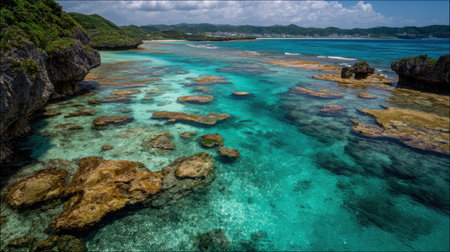 Rocky coastline and shallow turquoise waters of Okinawa stretch out under clouds, showing a tropical landscape with coral and marine life.