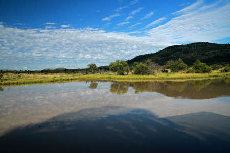 Landscape view of a lake surrounded by mountains and green savanna grassland, Pilanesburg Nature Reserve, North West Province, South Africa