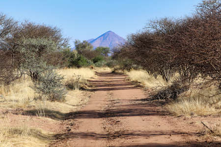 Dry, arid wilderness landscape covered in small shrubs, with a dirt road running in the foreground and a mountain range in the background at sunrise, South Africa
