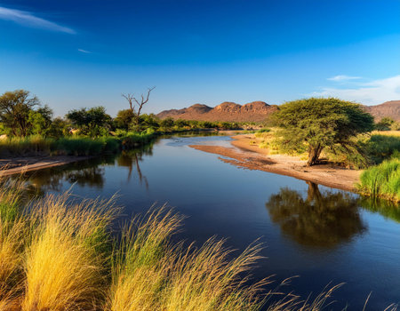 Namibian savanna landscape with river and acacia trees