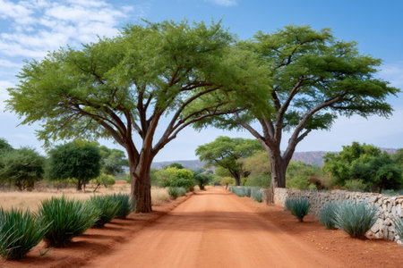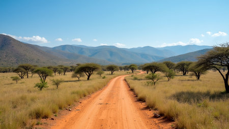 Savanna landscape with dirt path acacia trees hills and blue sky