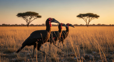 Stunning view of the African savanna at sunrise, showcasing rolling hills, golden grass, and a dramatic sky. An impressive reminder of nature's untouched beauty.
