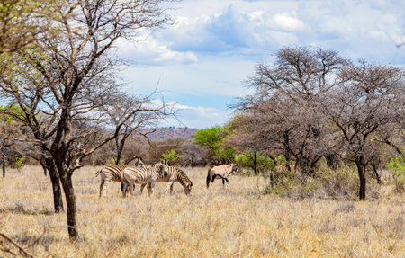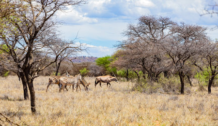 Plains zebra or Burchell zebra and common eland at Oanob park, African native animal. Namibia.