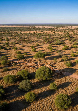 Aerial Photography, sprawling savannas, dry tropical climate, warm sunset light, wilderness, golden grasslands, scattered trees, wildlife habitats.