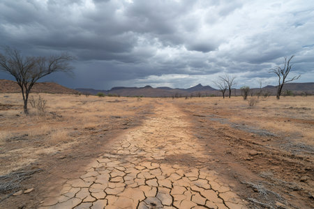 Dry cracked earth road disappearing into the distance in a dry desert landscape with mountains and storm clouds