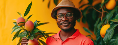 man in brown cap with hat and red polo shirt holding a mango tree, in the style of joyful