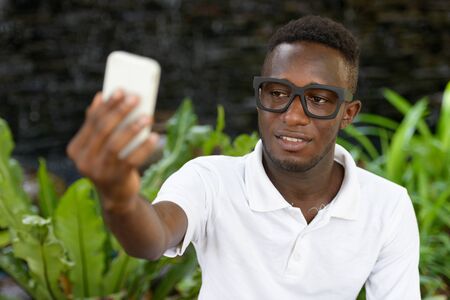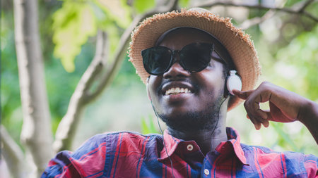 African traveler man sits happily listening to music on his mobile phone in the middle of nature with hat and sunglasses
