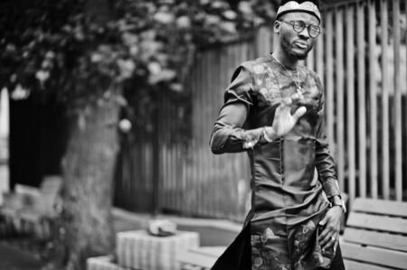 Handsome afro american man wearing traditional clothes, cap and eyeglasses in modern city.
