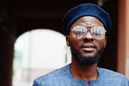 African guy in blue authentic costume, eyeglasses and beret. Fashionable nigerian man.