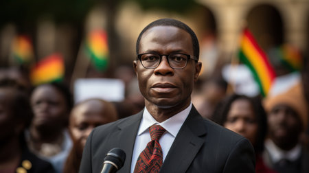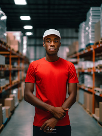 An AI generated illustration of A mature African-American man with a serious expression on his face, wearing a bright red sweater