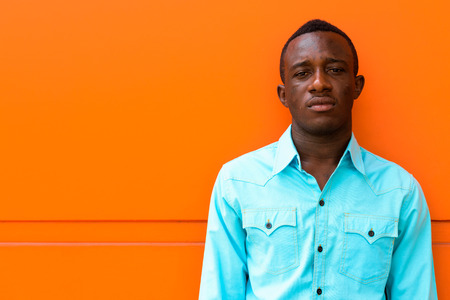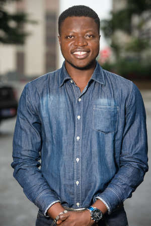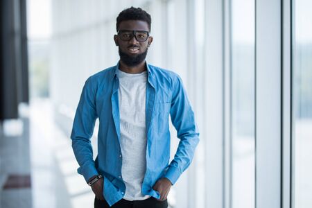 Classical portrait of smiling african american man in blue shirt at grey wall background