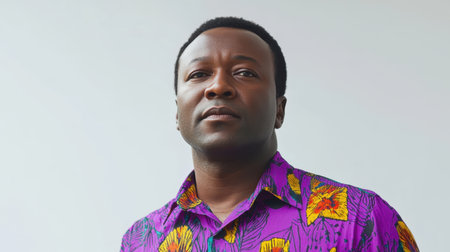 Close up portrait of a stylish young man wearing a vibrant, patterned shirt, exuding confidence against a dark backdrop