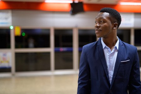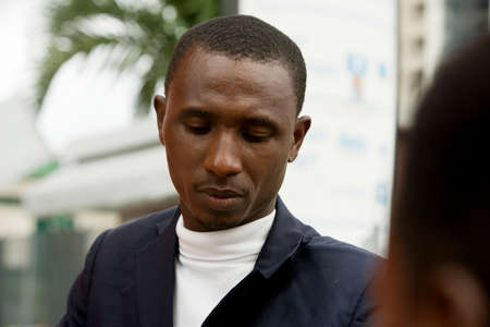 A happy smiling African businessman in a suit at a luxurious tropical beachfront hotel