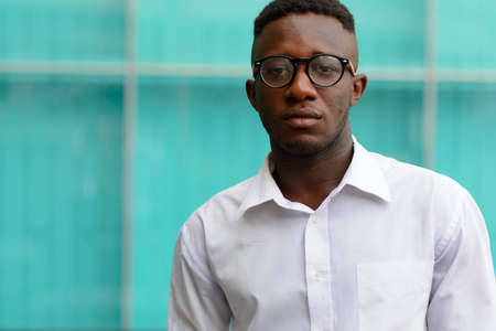 portrait of young man of african ethnicity, wearing glasses and colorful clothes, standing in a public square looking at the camera outdoors, with trees in the background and copy space.