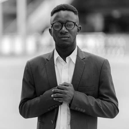 Successful African American businessman wearing eyeglasses exudes confidence at cafe. Concept Business Attire, Confidence, Eyeglasses, African American, Cafe