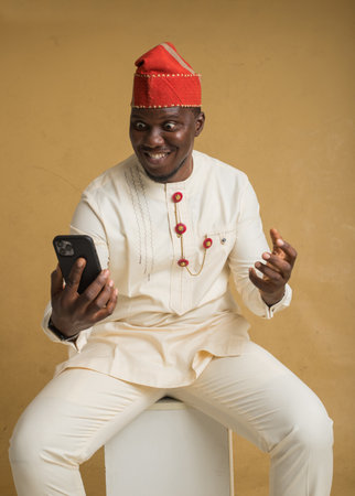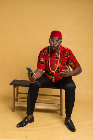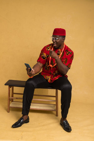 Igbo Traditionally Dressed Business Man Sitting Down and with Phone and jubilant