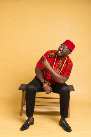 Igbo Traditionally Dressed Business Man Sitting Down and Smile and Point to the Side