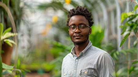 The picture of the african american male young entrepreneur is standing inside greenhouse, the entrepreneur require skill like creativity, leadership, financial management, sales and marketing. AIG43.