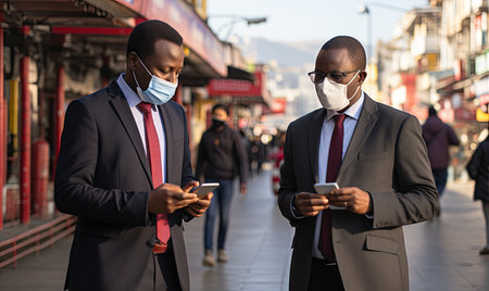 Two businessmen in formal attire and face masks engrossed in their cell phones.
