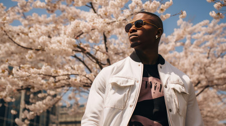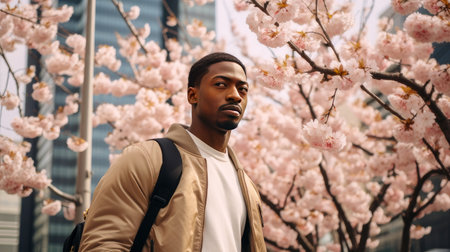 Modern happy young dark-skinned African guy against the background of blooming pink cherry trees and a metropolis city. spring blossoms, happiness joy dreaming love, Mental health, psychological treatment concept, positive thinking, good thoughts