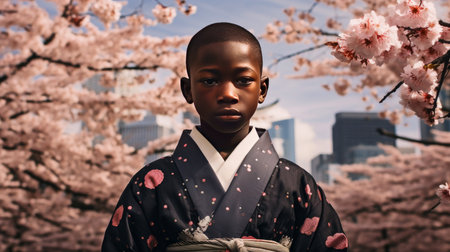 Modern happy young black African boy against the background of pink cherry blossoms and metropolis city. Businessman, spring blossoms, happiness joy dreaming love, Mental health, psychological treatment concept, positive thinking, good thoughts