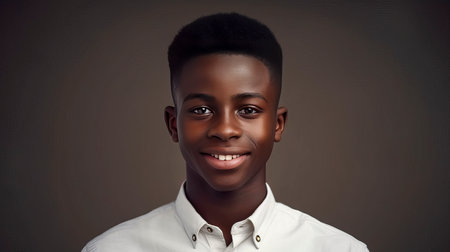 Portrait of a happy cheerful serious, troubled African American teenager guy with perfect skin, gray background, banner. Advertising of teenage cosmetics, hair care products, medicines, perfumes, cosmetology, courses, college schools and trainings