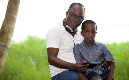 concept of family, paternity and people - father and son sitting in the garden and using a mobile phone