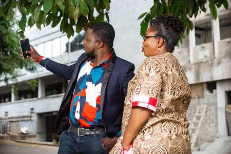 Friendly couple of business colleagues posing for the outdoor phone camera. Man and black woman having fun outside and taking picture.