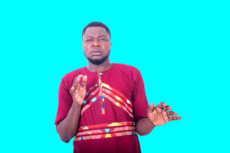 Portrait of a black young man wearing african traditional red colorful clothes.