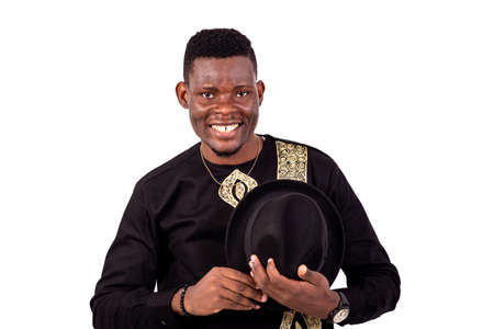 portrait of a handsome, well-dressed young man holding his hat while smiling at the camera.