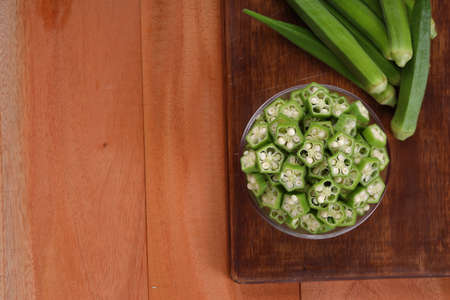 Okra or Lady's finger or Bhindi fresh green vegetable arranged on a wooden board with a glass bowl full of okra sliced rings with wooden background, selective focus ,top view.