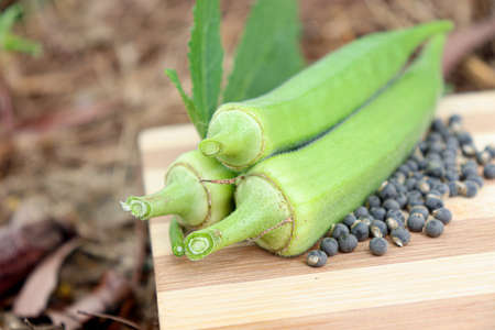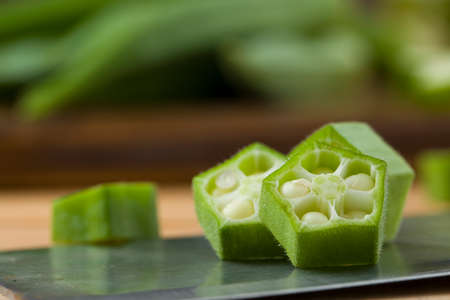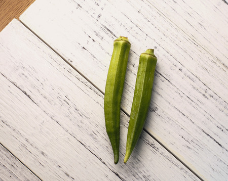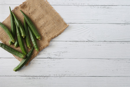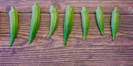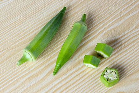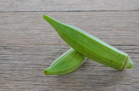 Fresh okra on the wooden table background.