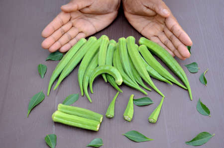 Green okra or ladies fingers (Edible green seed pods), Organic vegetables from local farmer market