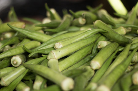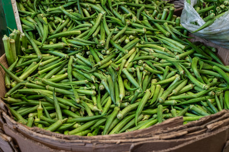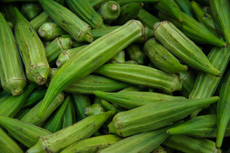 Fresh green okra pods on a market