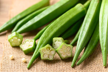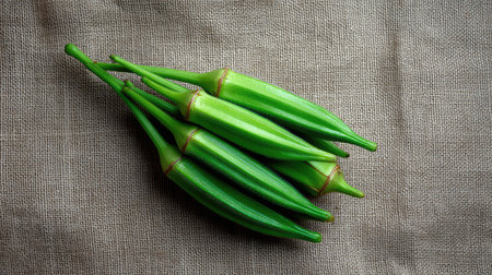 Fresh okra pods in an overhead layout on burlap fabric with natural light and ample space