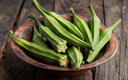 Fresh okra in wooden bowl on rustic wooden background, selective focus