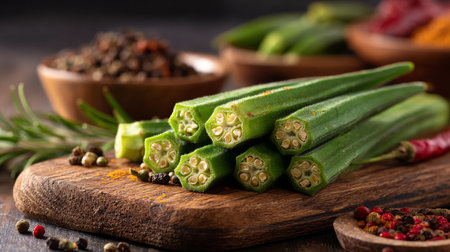 Fresh green okra sliced on a wooden board, showcasing vibrant colors with spices and herbs in the background, perfect for culinary art and recipes.