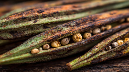 This detailed close-up captures brown seed pods revealing seeds within, showcasing natural textures against a rustic wooden background, perfect for botanical themes.