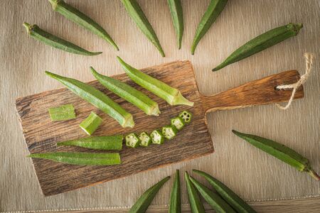 Okra or Lady's finger or Bhindi fresh green vegetable arranged on a cutting board with some sliced rings on wooden textured background, selective focus.