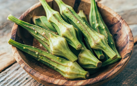 Fresh okra green vegetable wooden bowl rustic kitchen healthy food organic ingredient closeup sliced natural light raw cooking preparation