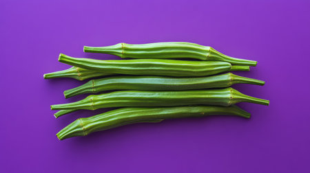 Vibrantly colored fresh green okra stacked neatly, ideal for culinary use. This image highlights the raw beauty of vegetables against a purple background, perfect for healthy cooking inspiration.