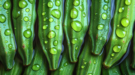 Lush green okra pods adorned with glistening droplets shine in soft morning light.