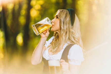 Pretty happy blonde in dirndl, traditional festival dress, drinking beer outdoors in the forest with blurred background. Oktoberfest, St. Patrick’s day, international beer day concept.