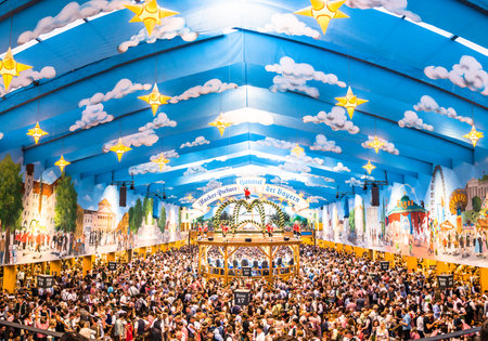 Munich, Germany - October 4: famous beer tent and people at the biggest folk festival in the world - the oktoberfest on oktober 4, 2018 in munich.
