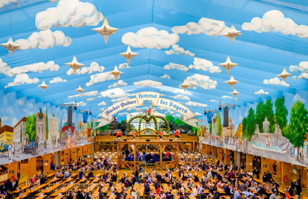 Munich, Germany - October 1: famous beer tent called Ochsenbraterei Spatenbraeu and people at the biggest folk festival in the world - the oktoberfest on oktober 1, 2018 in munich.