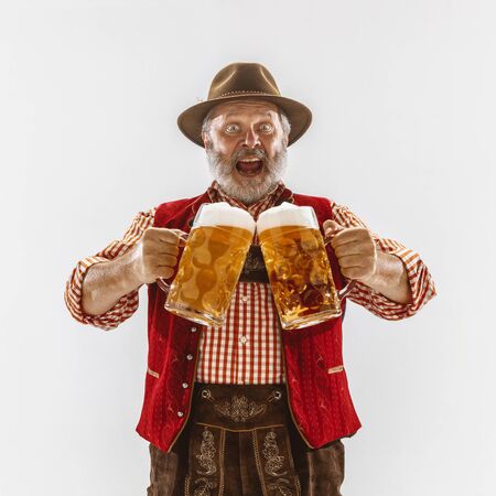 Portrait of Oktoberfest senior man in hat, wearing the traditional Bavarian clothes. Male full-length shot at studio on white background. The celebration, holidays, festival concept. Invites on beer.