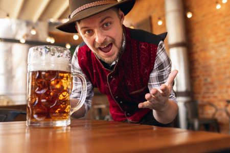 Portrait of Oktoberfest young emotional man in hat, wearing the traditional Bavarian clothes, holding beer mug. Alcohol, traditions, holidays, festival concept.