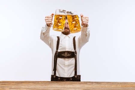 Half-length portrait of bearded man in hat and traditional Bavarian costume holding huge mug, glass of light frothy beer isolated over white background. Flyer